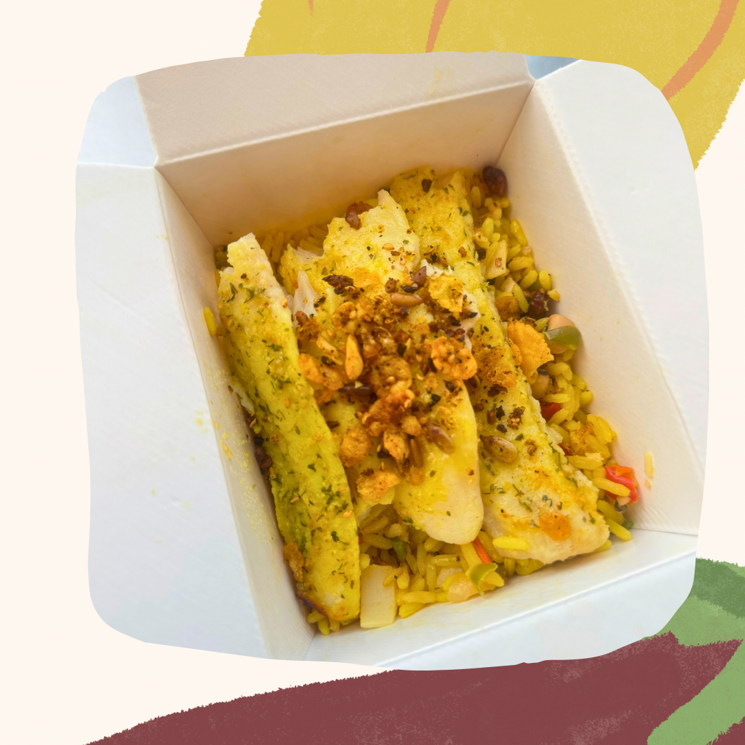 Arroz amazónico com cúrcuma, palmito, feijão-frade, banana, pimenta biquinho e castanhas. Servido com pescadinha branco assada com granola de sementes. Autoral, aromático e cheio de contraste.