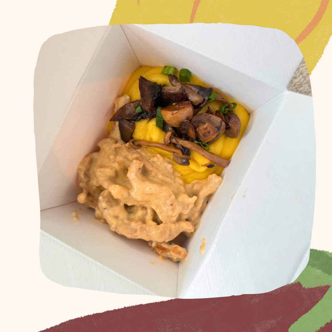Iscas suínas ao molho 4 queijos, musseline de mandioquinha e mix de cogumelos